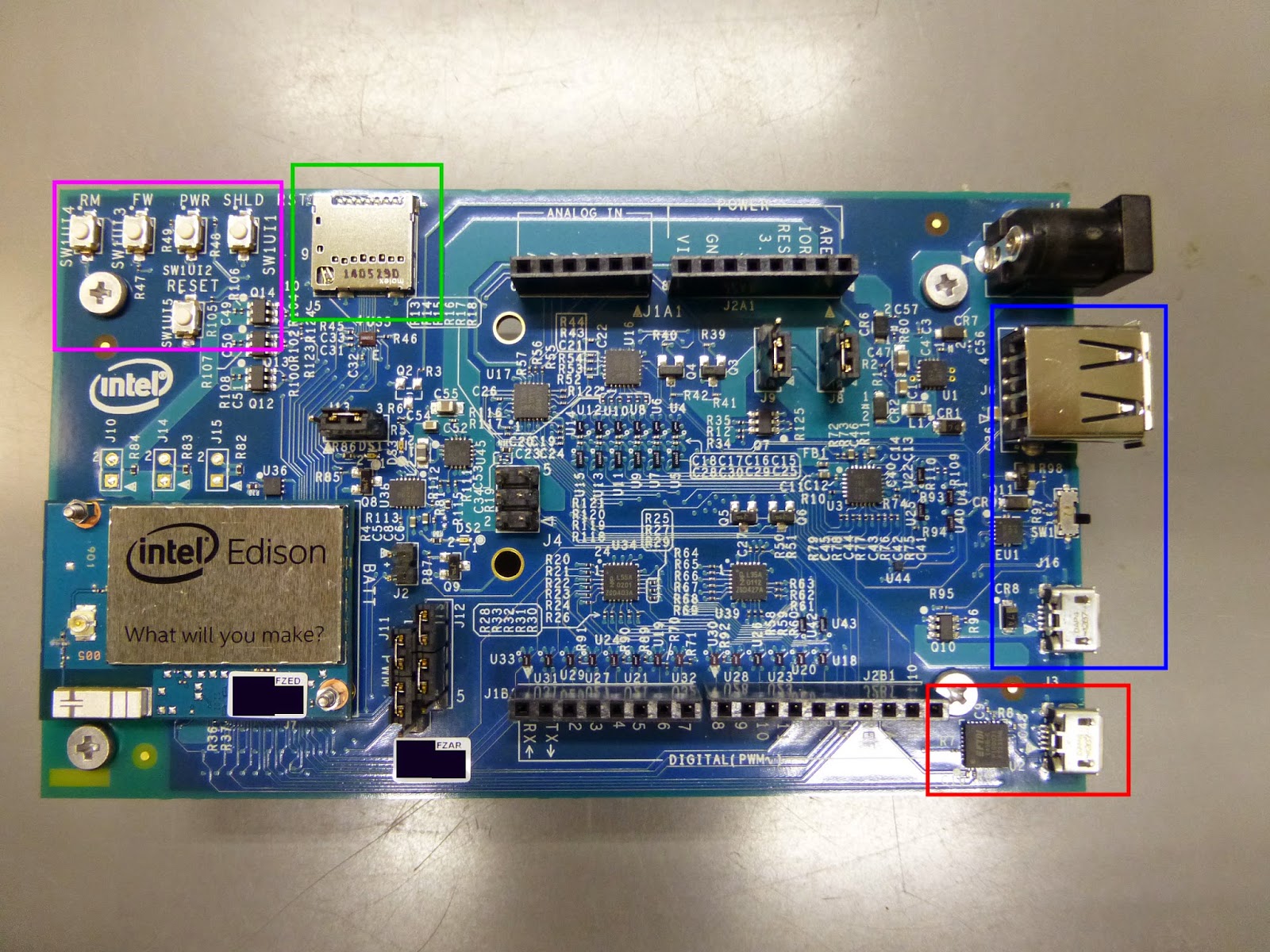 micro USB (J3) は,USBシリアル変換チップに接続され、シリアルコンソール用の端子であり,ここにキーボードやコンソールをつなぐイメージとなる。 ホストコンピュータにつなぐと USB Serial Port(Windows の場合) と認識され,この端子を通じてシリアル通信 (いわゆる tty 接続) で Edison に接続できる。